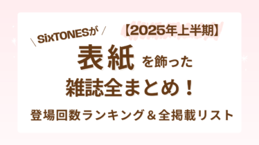 雑誌掲載 【2025年上半期】SixTONESが表紙を飾った雑誌全まとめ!登場回数ランキング&全掲載リスト SixTONESファンの皆さん、こんにちは!2025年、彼らの勢いは年明けから凄まじいものでしたね。... 2026.01.05 雑誌掲載